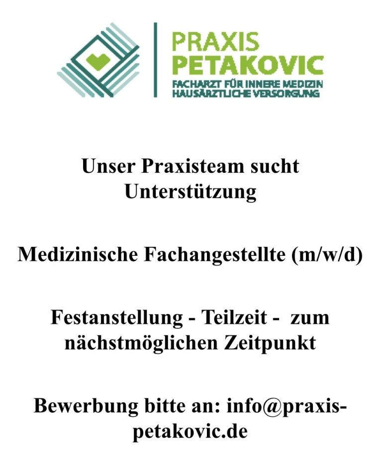 Vom 30. März bis zum 02. April befindet sich Herr Petakovic im Urlaub. In dieser Zeit bietet Frau Dr. med. Schmitz wie gewohnt Sprechzeiten an. Montag- und Dienstagnachmittag sowie am Donnerstag kann keine Sprechstunde stattfinden. Daneben stehen Ihnen unsere Medizinischen Fachangestellten zu den gewohnten Sprechzeiten zur Verfügung. Bei dringenden ärztlichen Angelegenheiten wenden Sie sich an unsere Vertretung: